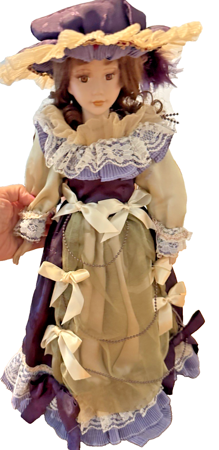 Vintage Doll 21"- Victorian Porcelain, Long Curly Hair, Dress, Hat, Shoes